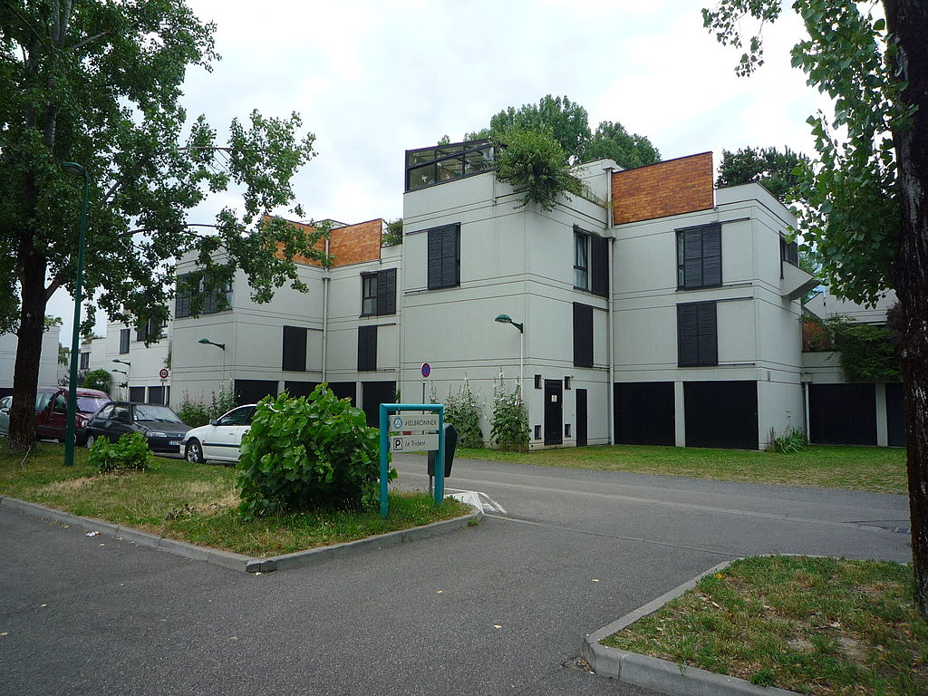 La Résidence 2000 fait partie de la Villeneuve, dont elle borde le parc central, au Nord et à l’Est ; elle assure la transition du nouveau quartier avec le tissu pavillonnaire préexistant. Réalisée en plusieurs tranches, elle se caractérise par une forme d’habitat dense, avec des parties communes – sous-sol réservé au stationnement et accès – et des parties privatives comportant, grâce au savant jeu de retraites successives associé à des plans d’appartement en L, des terrasses fermées par de puissants bacs à fleurs en encorbellement destinés à sauvegarder l’intimité. La volonté de se fondre dans la nature passe par les matériaux : béton brut ou brique qui dominent en pignon avec des ouvertures de faible taille. Des escaliers en vis encagés dans des tours viennent enrichir la composition plastique.