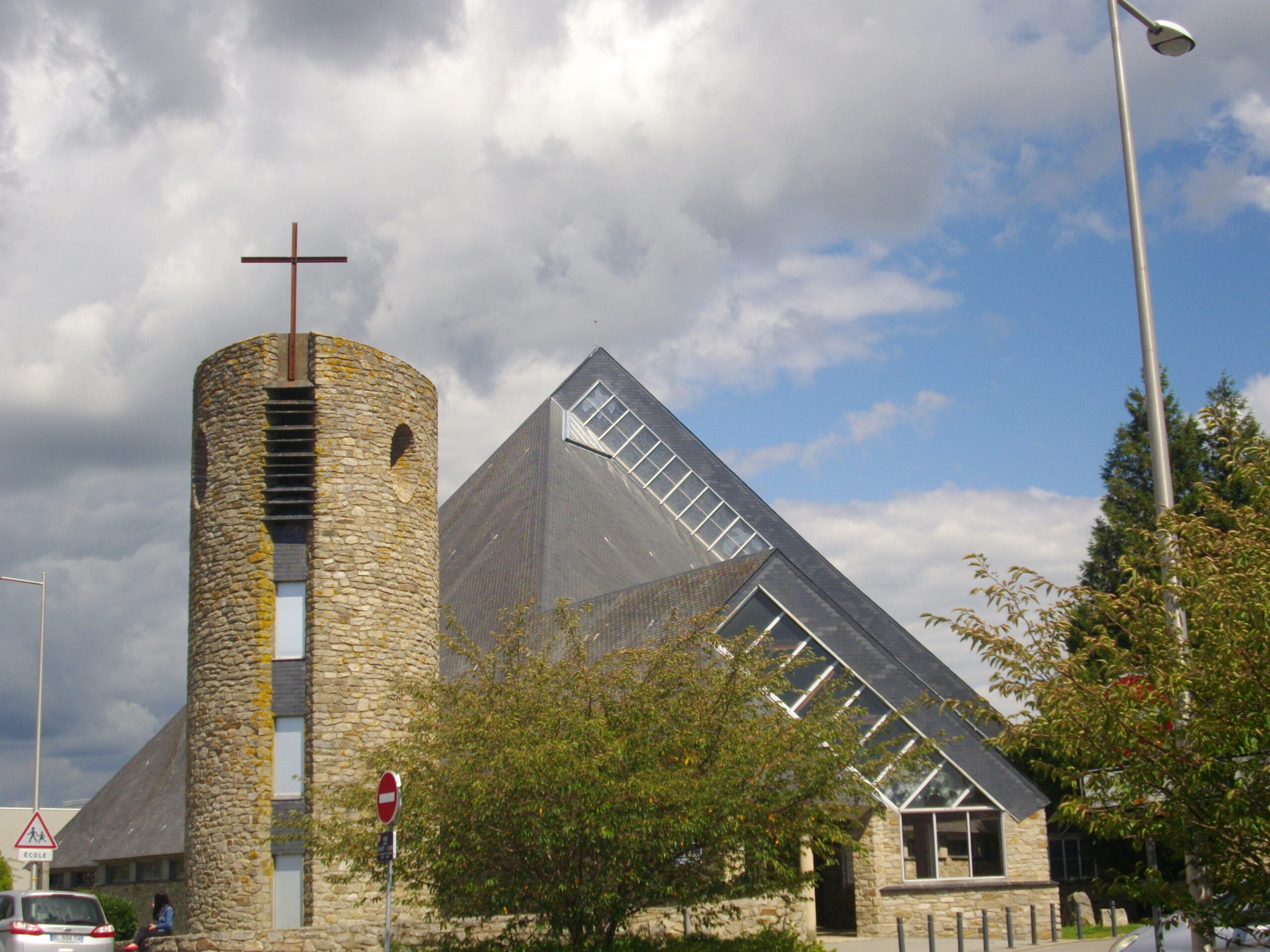 Destinée à une nouvelle paroisse couvrant le quartier populaire en plein essor de Ménimur, au nord de Vannes, l’église est une des premières construites en Bretagne au lendemain de Vatican II, dont elle applique immédiatement les directives en matière de liturgie. Géométrie et lumière sont les maîtres mots de cette construction pouvant accueillir jusqu'à 1000 fidèles : figures élémentaires (avec le triangle pour module), symbolique de la pyramide, intérieur clair et accueillant sous une charpente en lamellé-collé, vitraux de Claude Guillemot dessinant une bande colorée entre maçonnerie et toiture, recherche d’une liaison organique entre l’assemblée et le célébrant. Apprécié des fidèles pour ses qualités esthétiques et fonctionnelles, l’édifice est très vite publié dans des revues religieuses.