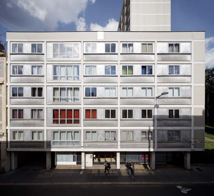 Le premier projet consistait en un immeuble de dix étages implanté le long de la rue Valbenoite. On décida finalement de respecter le gabarit sur rue en ajoutant perpendiculairement un corps de bâtiment en retour. Un portail ouvert côté rue Antoine Durafour marque l’entrée de la parcelle. Les limites du terrain sont marquées uniquement par des arbres et une simple haie. Des portiques traversants facilitent les accès d’un côté de l’édifice à l’autre. A l’arrière se situe l’aire de stationnement où là encore aucune barrière ne ferme l’ensemble. Le parking ne peut plus accueillir les voitures de tous les résidents. Le corps principal est construit sur 14 niveaux distribués par le nord. L’accès est précédé par un long porche constitué de poteaux/poutres en béton armé avec des dalles pleines. Le sol est traité par un revêtement minéral disposé sous le bâtiment. Les halls intérieurs situés sur les demi-paliers desservis par les ascenseurs forment de vastes volumes vitrés avec des huisseries en bois. Ils donnent aussi accès aux caves. La cage d’escalier est éclairée naturellement et on peut la distinguer sur la façade nord. Chaque palier dessert deux appartements ainsi qu’un rangement commun un vide-ordure. Les appartements sont similaires avec un couloir central qui dessert l’ensemble des autres pièces soit au sud soit au nord. La hauteur sous plafond est de 2m50. L’intégralité des appartements étant traversant, chaque pièce bénéficie de l’éclairage naturel. L’immeuble fonctionnait avec un chauffage central par le sol au charbon, autre grande innovation. Les façades de Jean Prouvé sont en aluminium. La répartition des percements varie selon leur destination. Les panneaux sont tenus dans des huisseries en bois, enchâssées directement dans l’ossature en béton armé. La finition intérieure est en bois. Ces panneaux sont préparés en atelier pour améliorer la qualité et réduire les coûts. Ce type de construction est innovant pour l’époque avec le recours à l’aluminium utilisé pour la première fois pour un immeuble résidentiel. L’architecte rêvait de construire des grands ensembles aussi bien que les maisons comme une « automobile ». Les modules, qui génèrent le rapport plein/vide, rythment la façade de manière aléatoire. La façade est est la seule où l’on trouve des loggias. La maison de l’aluminium est un prototype des années 50 en matière de logement pour tous et d’architecture. Elle s’intègre parfaitement dans le paysage stéphanois et les habitants sont heureux d’y vivre avec d’une part cette mixité sociale instaurée dès le départ et d’autre part des commerces au rez-de-chaussée qui apportent de la vie à l’immeuble. L’ENSA de Saint Étienne a relevé deux soucis techniques : le problème de l’isolation des panneaux d’aluminium et l’absence d’occultation sans compter les ponts thermiques qui préjugent d’une délicate mais passionnante réhabilitation thermique à venir.