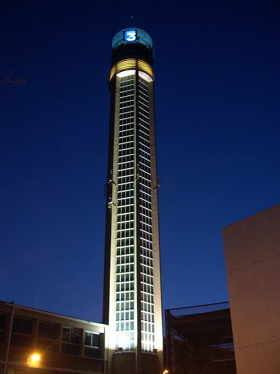 ""Au début du mois de janvier 1954 est implanté à Marseille un émetteur de télédiffusion régionale. C’est le premier implanté sur le sol français, deux autres l’avaient été auparavant à Lille et Paris. Quelques semaines plus tard, ce sera au tour de Lyon. Situé sur la chaîne de l’Etoile, cet émetteur marseillais peut diffuser des programmes sur toute la capitale phocéenne. Dans le même temps, une nouvelle maison de la radio-télévision est construite allée Ray-Grassi. Le 20 septembre 1954, on inaugure les locaux de la télévision provençale au parc Chanot à Marseille, et l’on met en place le principe du décrochage régional. Avec ses grands locaux et ses studios flambant neufs, la télévision provençale est, dès sa naissance, mieux lotie que ses consoeurs des autres régions. C’est dans ce bâtiment historique que siège aujourd’hui encore France 3 Méditerranée."" Eugène Michelis, gendre de Gaston Castel, est l’ingénieur de l’ensemble des bâtiments. Joseph Lajarrige et Louis Poutu, qui sont intervenus fréquemment dans la région, seraient les architectes de la tour. Source : France Télévision Interactive, 2005