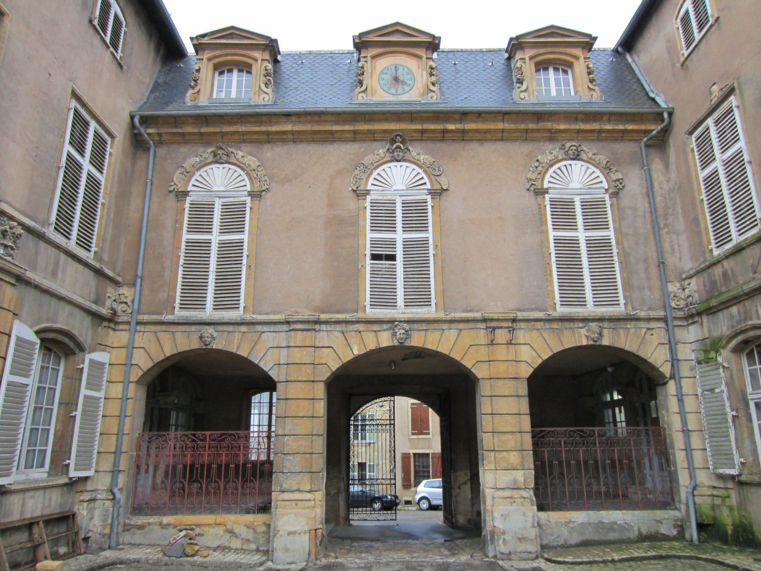La porte d'entrée, les escaliers, les terrasses et les murs de soutènement décorés de fontaines : classement par arrêté du 21 septembre 1932 - Les parties anciennes du palais abbatial en totalité, le sol de la cour et le sol de ses jardins (cad. 1 143, cf plan annexé à l'arrêté) : classement par arrêté du 9 mai 2006