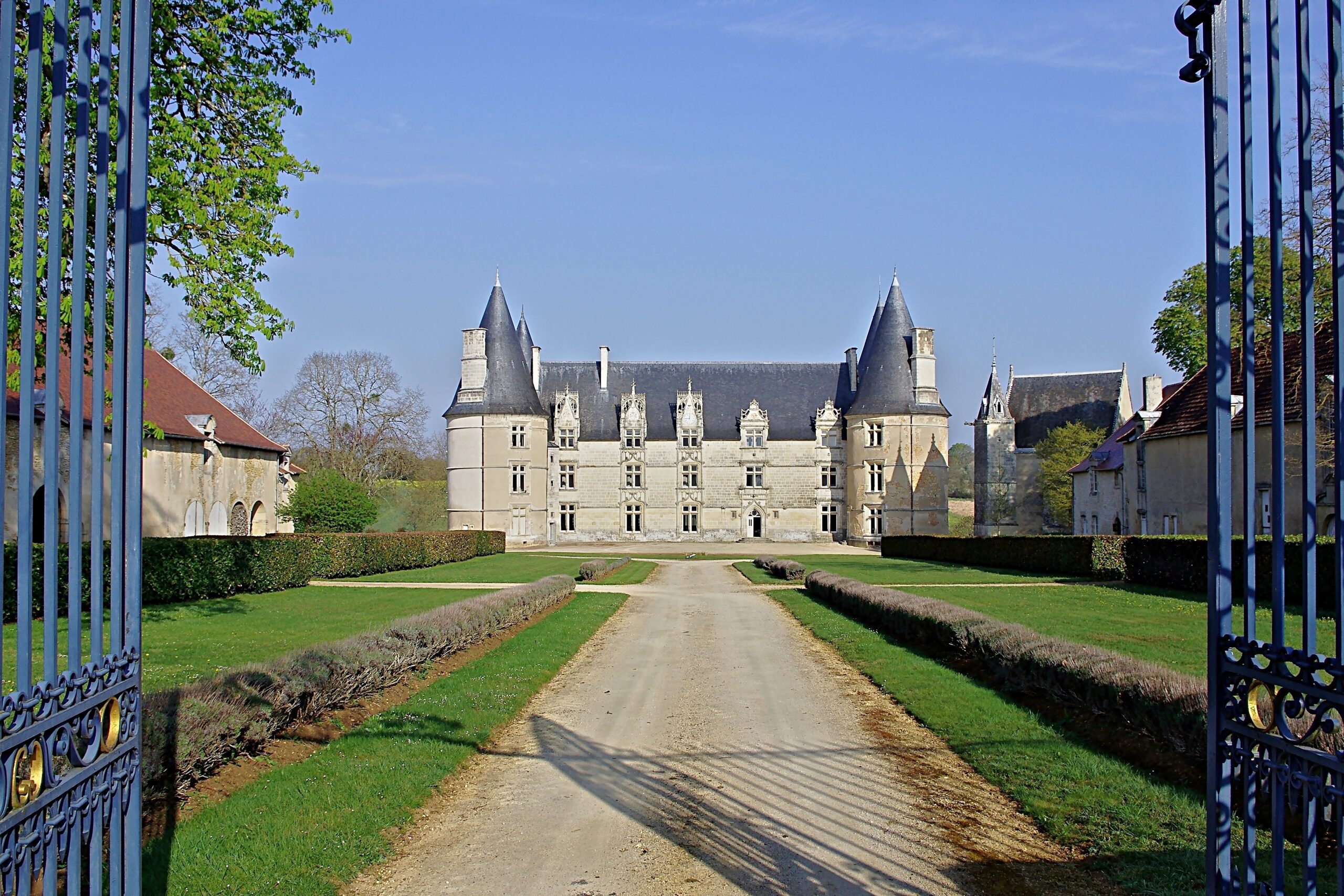 Façades et toitures du château avec ses quatre tours et des communs ; chapelle ; escalier principal à volées droites ; les pièces suivantes avec leur décor : les trois salons, la salle à manger, l'embrasure de la pièce de la tour du Vieux Jardin du rez-de-chaussée, puis les quatre pièces lambrissées du corps de logis principal, les trois pièces anciennes des tours, l'embrasure de la fenêtre de la bibliothèque dans la tour du Puits ou du Commandeur du premier étage (cad. C 11) : inscription par arrêté du 23 décembre 1981